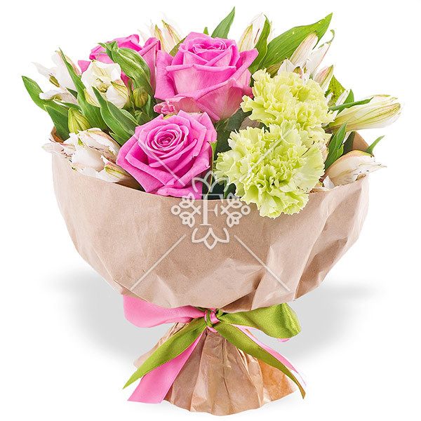 роза розовая - 3 шт., альстромерия белая - 1 шт., гвоздика зеленая - 1 шт., декоративная зелень., упаковка крафт., лента.
