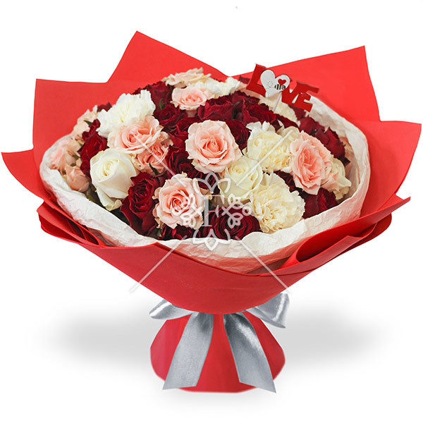 Классические розы алого, нежно-розового и молочно-белого оттенков выглядят ослепительно прекрасно, восхищают ароматом и чаруют изящностью. Дополняют это совершенство ванильные гвоздики, которые гармонично смотрятся в единой композиции.